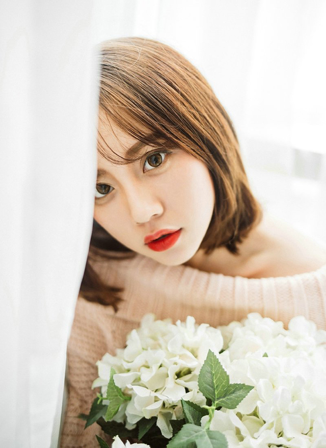 红唇卷发美女低胸开叉长裙性感火辣私拍