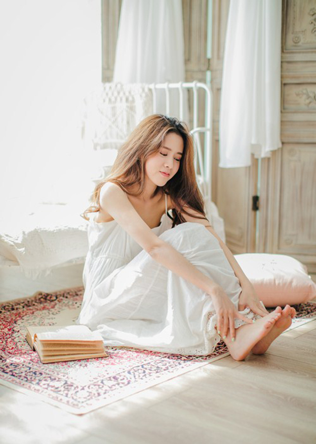 红唇卷发美女低胸开叉长裙性感火辣私拍