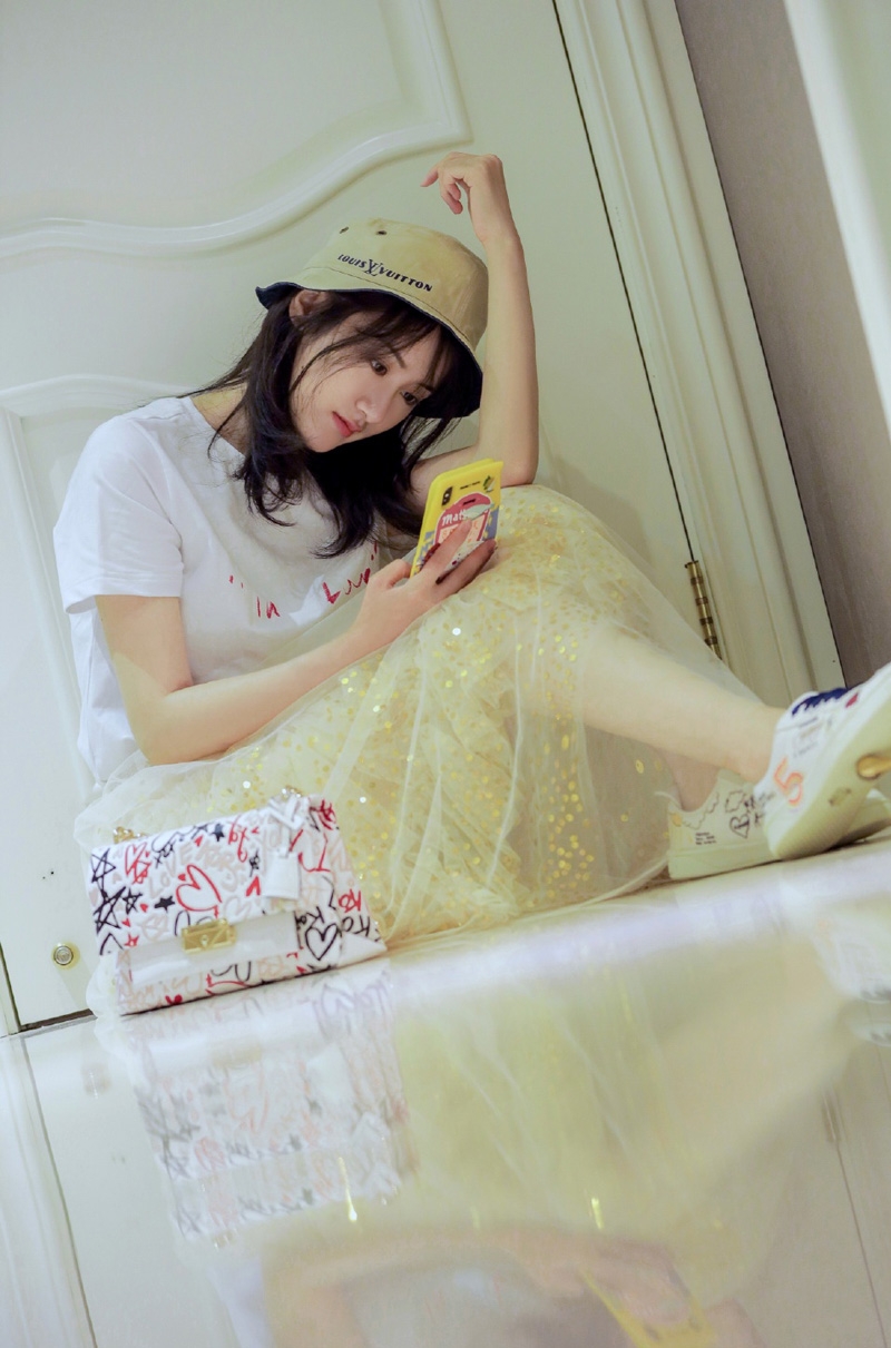 袁冰妍白色T恤搭配黄色纱裙清新文艺写真