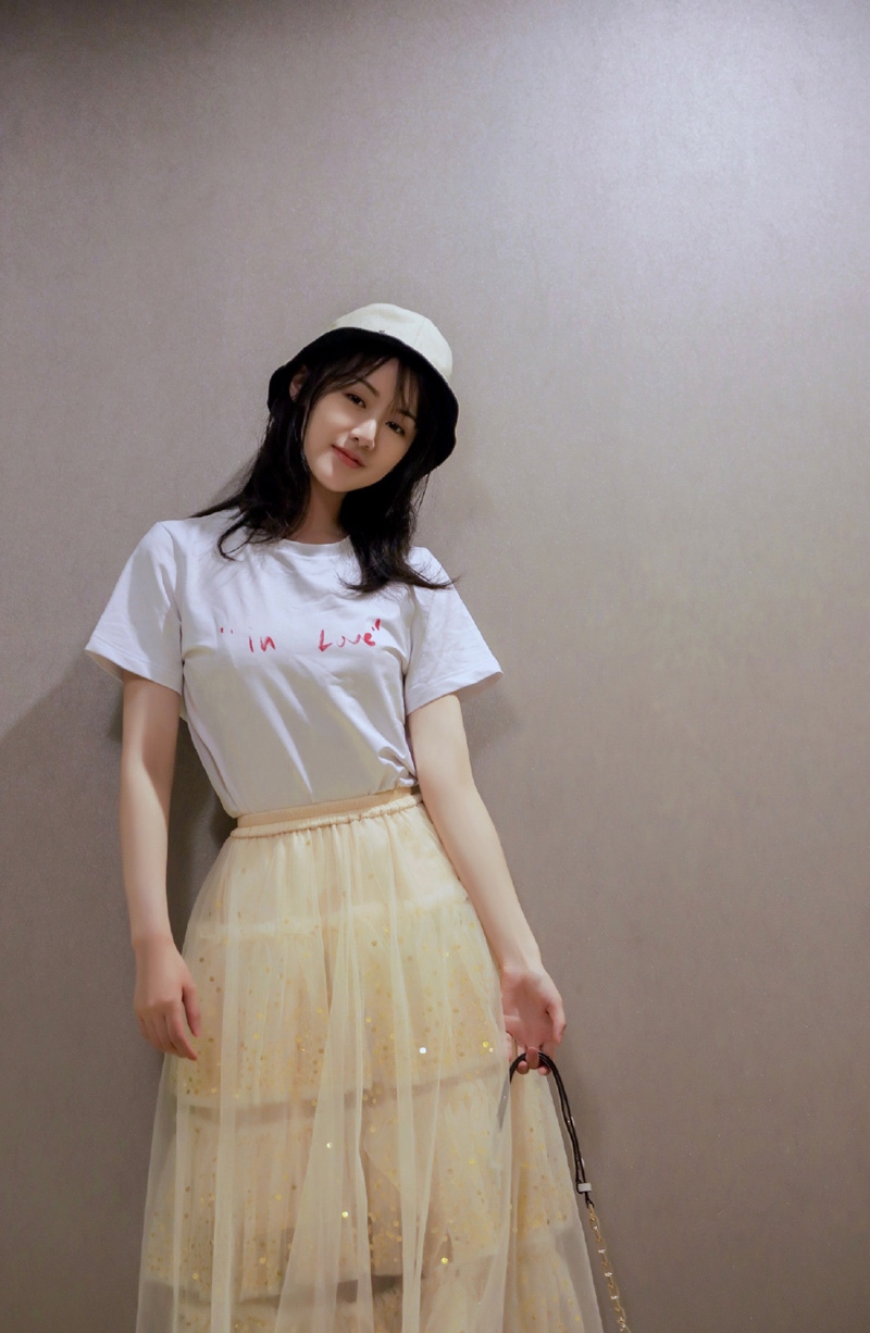 袁冰妍白色T恤搭配黄色纱裙清新文艺写真