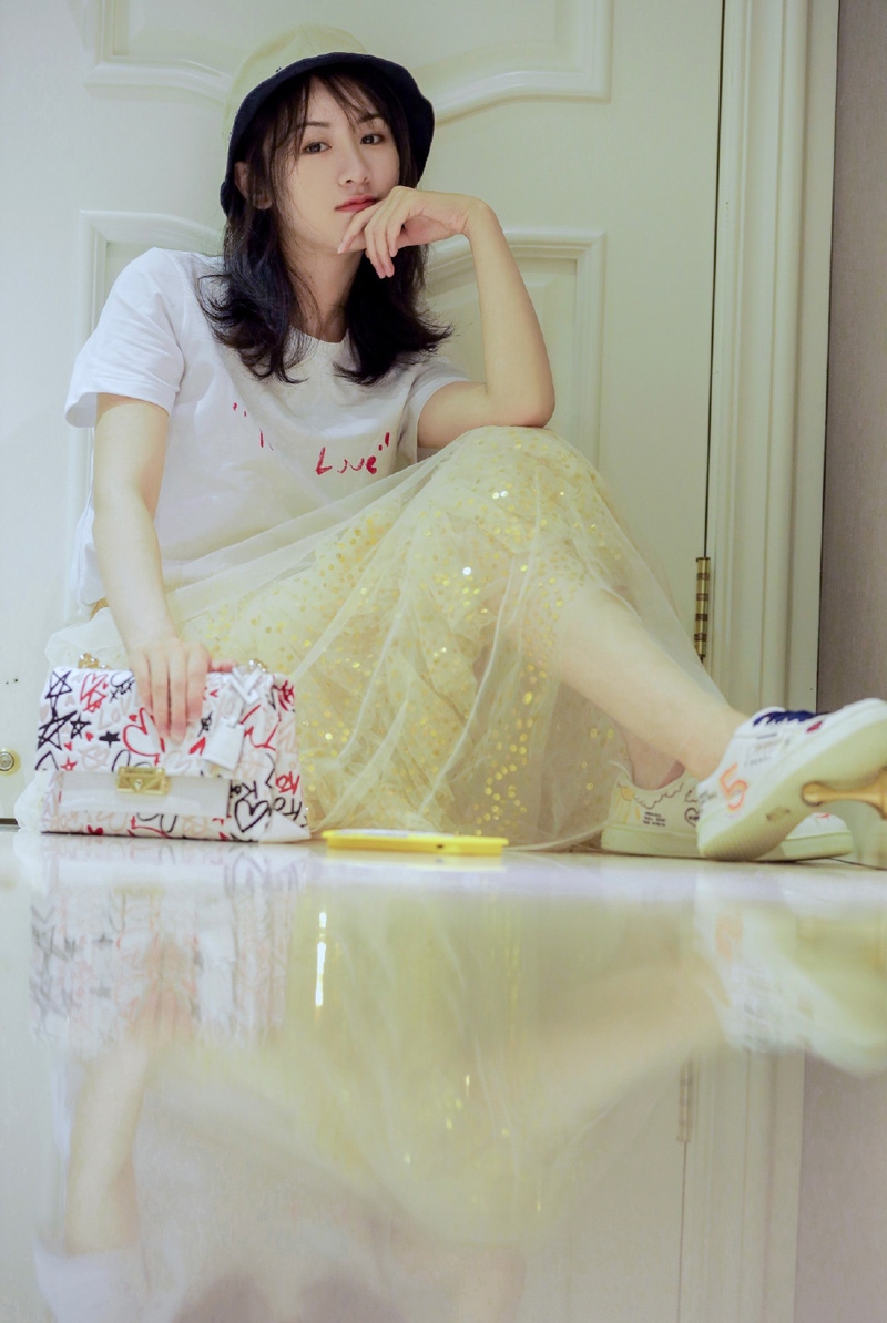 袁冰妍白色T恤搭配黄色纱裙清新文艺写真