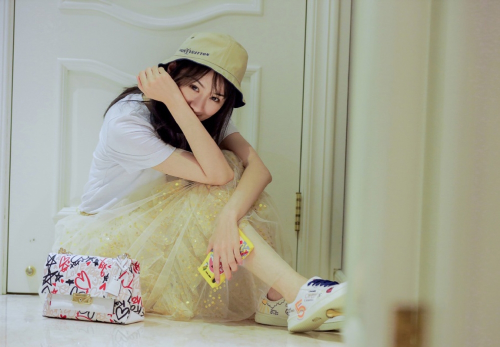 袁冰妍白色T恤搭配黄色纱裙清新文艺写真