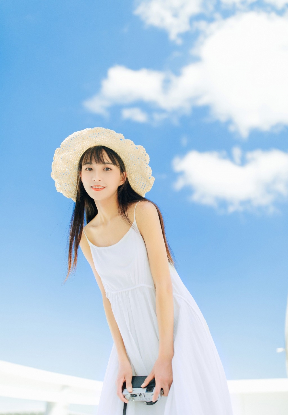 蓝天白云下的清纯草帽mm吊带长裙文艺写真