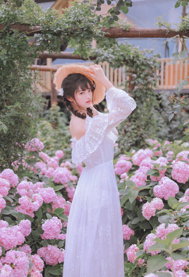 谭松韵白色花朵婚纱裙户外梦幻写真