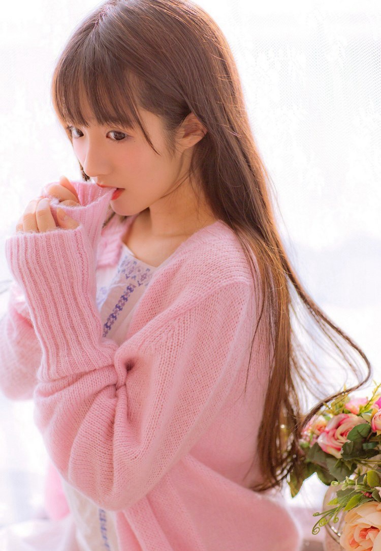 张雅钦短发凌乱手抱花束清纯可人私房照