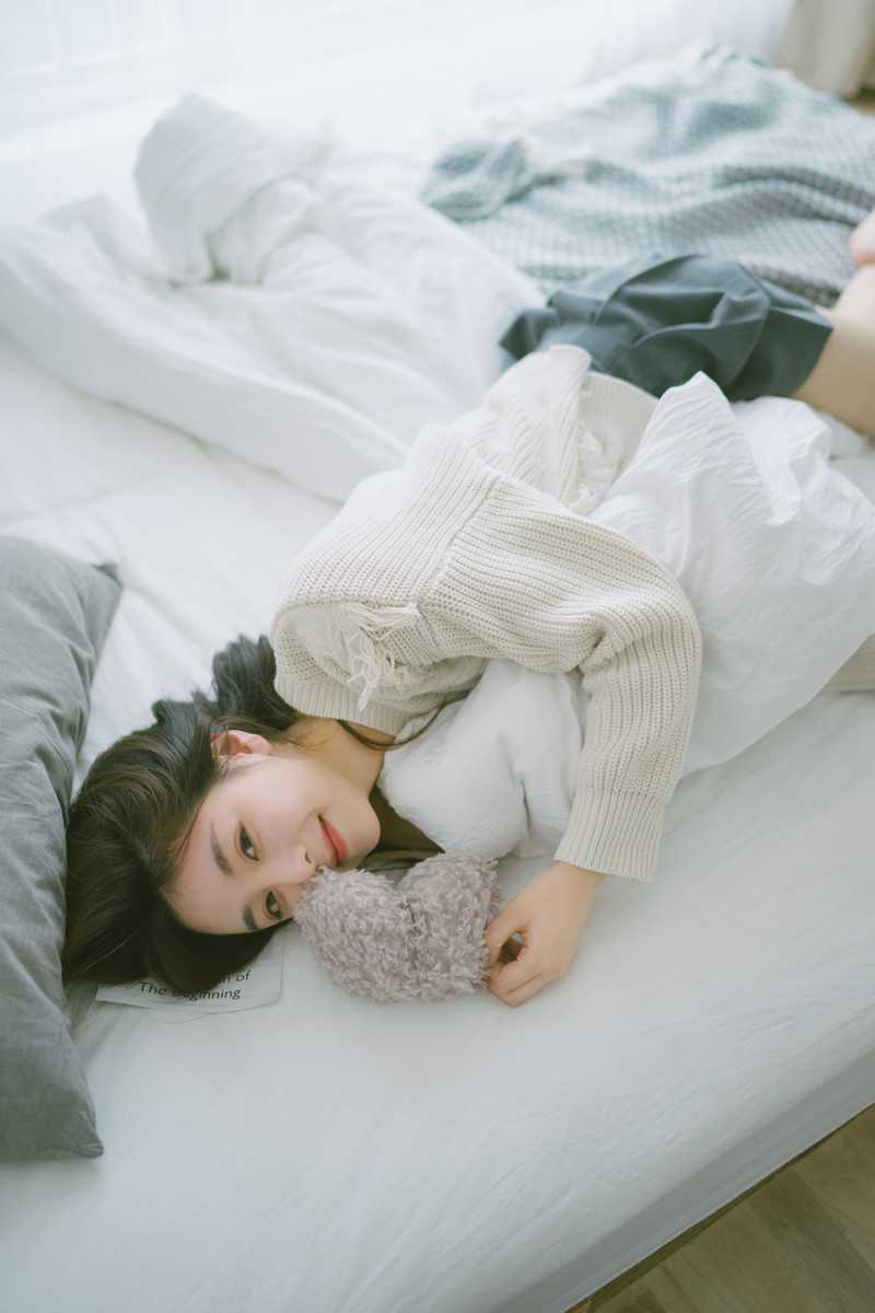 大眼睛美眉白皙大长腿床上慵懒随性写真