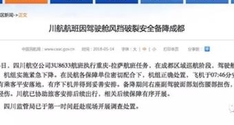 2018年5月14日,3U8633航班在成都区域巡航阶段,驾驶舱右座前挡风玻璃突然破裂脱落,机组实施紧急迫降。