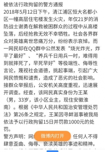 淮安一小区失火消防员不幸坠落后续:一网民侮辱救火牺牲英雄被行政拘留
