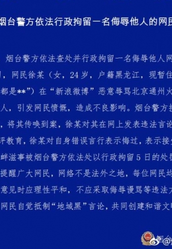 中新网5月4日电 山东省烟台市公安局网络安全保卫支队官方微博今日发布情况通报。通报称,一女子在微博恶意辱骂北京通州火灾中牺牲的消防战士和北京人,造成不良影响,因寻衅滋事被烟台警方依法处以行政拘留5日的处罚。