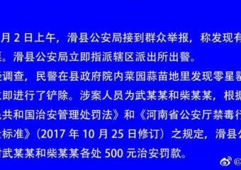 据河南省安阳市滑县公安局官方微博通报,5月2日上午,警方接到群众举报,在县政府院内菜园里发现零星罂粟,现场立即进行了铲除,对两涉案人员各处500元治安罚款。