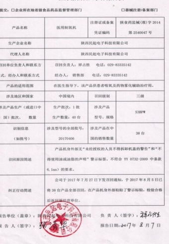 中国质量新闻网讯 从陕西省食品药品监督管理局官网获悉,根据陕西民起电子科技有限公司召回报告,由于该公司生产的医用制氧机外部警示标签不符合YY 0723-2009中的条款要求,陕西民起电子科技有限公司对其生产的医用制氧机(批号:20170406)主动召回,召回级