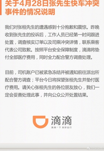 4月29日消息,疯蜜创始人张桓发文称被滴滴司机殴打,在文中其认为滴滴出行平台司机管控不力,处理问题拖泥带水,遮遮掩掩想小事化了,建议微博公开道歉,并称将卸载滴滴,贱卖滴滴的所有投资。