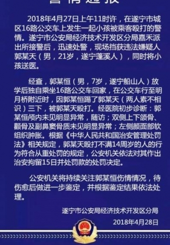"熊孩子"公交上踢人遭背摔踩头 打人者被拘留15日