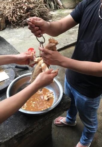 第一步当然是提前把一只三斤重宰好了的鸡腌制好啦!必须得入味才行!将鸡放入卤水汤中浸泡,由于鸡肉大腿根部及鸡翅根部的肉比较厚,需要用小刀划几刀,以便更入味,放入冰箱中冷藏腌渍两天。