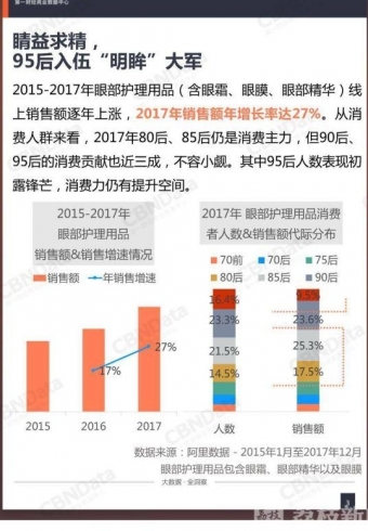 近日,第一财经商业数据中心(CBNData)发布了《2017线上眼部护理用品相关消费系列研究》(下简称《研究》),基于阿里数据,以眼部护理用品中的眼霜、眼膜、眼部精华三个品类为研究对象,通过洞察 2015年1月至2017年12月线上各年龄段消费人群对眼部护理用品