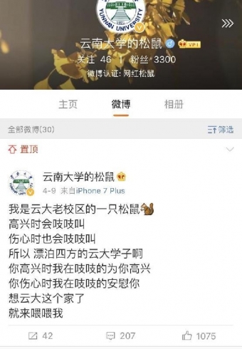 萌!云南大学的松鼠也有微博了 每天发“吱吱吱”晒自拍照走红