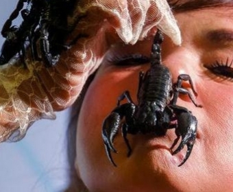 当地时间2017年6月17日,泰国芭堤雅为前来的的旅客表演吃鞋子,女子拿起了蝎子就往嘴里放。