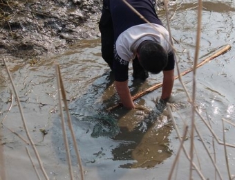 农村小伙河边抓鱼,一家齐上阵收获满满