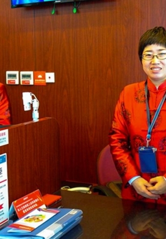 锦州银行沈阳站支行营业员穿唐装接待顾客