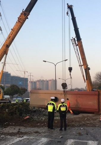 扬子晚报网3月13日讯(记者 郭一鹏 通讯员 李鑫) 3月13日凌晨4时43分,交警六大队接到报警,称郑和北路(郑和中路高架前方)东向西方向一大型货车侧翻,副大队长郜大鹏迅速带领警力前往现场处置。只见一辆重型货车横卧在路面,中心隔离绿岛已经被撞坏一大
