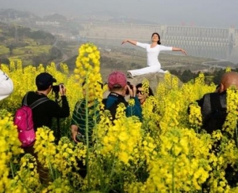 湖北大妈三峡大坝前练瑜伽 秀身材引游客围观
