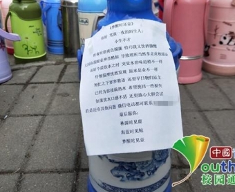中国青年网北京3月12日电(记者 李华锡 实习记者 闫春旭)近日,河南农业大学新媒体中心学生唐广辉向记者反映,3月9日,在该校文化路校区水房里,一个贴着纸条的蓝色水壶格外显眼。水壶上贴着一张颇具文艺的《致歉信》,最后写道:愿丢壶的同学“林深时见鹿,