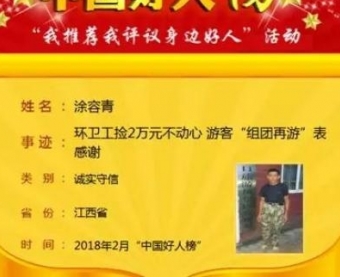 捡到2万元不动心,九江环卫工人涂容青荣登“中国好人榜”