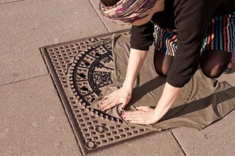 女子把衣服丢井盖上挤压,路人看到成品后,也争相尝试