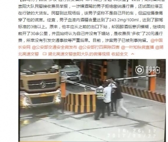 人民网北京9月25日电据湖北省公安厅高速公路警察总队二支队崇阳大队官方微博通报,22日,湖北省高警崇阳大队民警接收费员举报,一涉嫌酒驾的男子拒绝缴纳通行费,还试图拦停正在行驶的大货车。民警到达现场后,该男子坚称不是自己开的车,但监控摄像揭穿了他