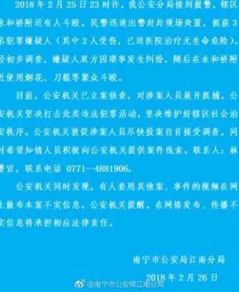 中新网南宁2月26日电(记者 林浩)2月26日凌晨,南宁社交媒体狂刷几段聚众斗殴的视频,视频显示现场参与打架的人数不少,有人拿刀,有人拿长棍。