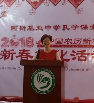 2018年2月24日,驻马里大使陆慧英出席马里孔子课堂新春文化活动。马里高等教育和科研部、国民教育部代表、在马华侨华人代表等共150余人出席。