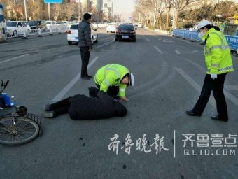 原标题:暖闻|轿车路口碰撞自行车,聊城交警跪地救助倒地老人