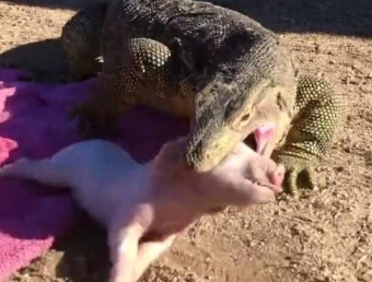 我刚看到一段视频,真的是满“震惊”,这是前段时间在一家动物园内发生的事情。一只巨蜥Rex正在吃饭,而它所食是一头粉红色的小猪,这只小猪似乎是死后被扔在了那里,而这只巨蜥便上前开始吞噬小猪。