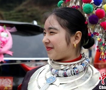 广西三江侗族新娘回门 送亲队伍挑酒肉同行