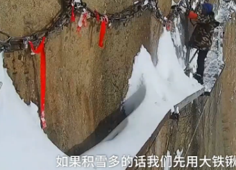 华山的长空栈道,在万仞绝壁上镶嵌石钉搭木椽而筑。每次下雪,景区人员便会系好安全绳索,带上防滑脚链,在百米悬崖上扫雪。工作虽危险,但工作人员说:平时就在山上住,出门就能看到风景心情也很好。