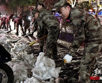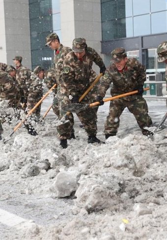湖南省军区第一时间组织官兵和民兵参与铲雪除冰等工作