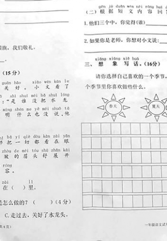 南宁市一份小学一年级语文期考试卷引热议