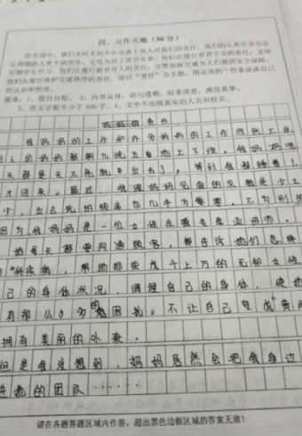 近日,一篇题为《妈妈的责任》(后被老师改为《责任》)的小学生作文在网上被疯狂传阅。从这篇被老师评为“优”的作文的字里行间,我们能感受到孩子对于母爱的那种深深的渴望,我们更能感受到一个懂事的孩子对于忙碌的妈妈那一份爱和关心,还有对妈妈所从事的