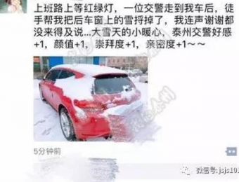 1月25日上午8点多,在江苏泰州凤凰路与鼓楼路路口,一位车主在等待红绿灯的时候看到前方有一名交警正在为前方停下的车辆擦去车子后框玻璃与后视镜上的积雪。她用镜头记录下了这样温暖的一幕:
