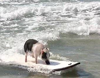 【环球网综合报道】冲浪一直被视为一项冒险运动,敢于尝试的人寥寥可数,而一些动物却能勇敢地克服恐惧,甚至爱上冲浪带来的乐趣。据英国《每日邮报》1月24日报道,美国加利福尼亚州的一只小猪就喜欢站上冲浪板,体验冲浪带来的刺激感受。