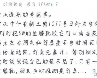 1月23日老娘舅张玉霞律师在微博上爆料,当天中午,她朋友在上海斜土路1077号日料店紫料亭午餐吃饭,进门时把SW的过膝靴放在门口由店家收起。两点左右她朋友和邻桌差不多时间买单,商家取来两桌的鞋,邻桌先离开。等到她朋友准备离开的时候发现自己的鞋不见了