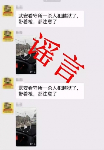 人民网1月24日电 (孝金波 王亚静)1月22日,“武安看守所一杀人犯越狱了,带着枪,都注意了”的消息在网上传播,并配有视频,引起网民关注。1月23日,邯郸网警回应,经核实,网传消息系谣言,视频内容实为武警中队开展防暴演练。