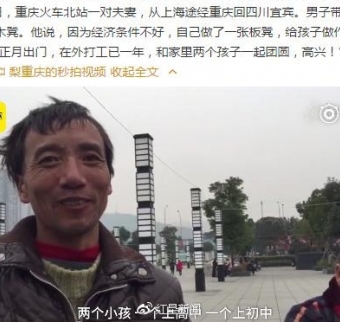 21日,有媒体报道了一名从上海打工返回家乡过春节的宜宾籍农民工,因为他背着自己在工地上做的小木凳乘车19小时,带回家给孩子写作业用,被媒体称为“板凳爸爸”。录制有其对话的短视频3天之内被播放330多万次,中国之声、中国新闻网等媒体微博转发,这位不知