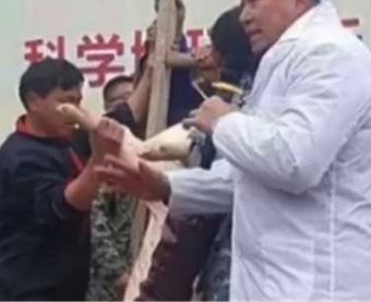 1月19日,湖北恩施福娃娃幼儿园创办人向宏茂为600多名儿童演示“杀猪”。