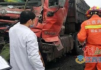 中国江西网讯 林峰、全媒体记者刘健摄影报道:1月21日下午1时许,在分宜县杨桥镇集镇上,因雨天路滑两辆大货车追尾相撞,追尾货车的驾驶室严重变形,司机受伤被困。在剧烈撞击下,货车油箱破裂并漏油。