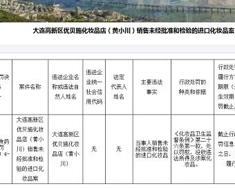 中国质量新闻网讯 据大连市食品药品监督管理局官网2018年1月15日发布的行政处罚决定书((大)食药监妆罚〔2018〕4-1号),大连高新区优贝施化妆品店(黄小川)涉嫌销售未经批准和检验的进口化妆品被行政处罚。