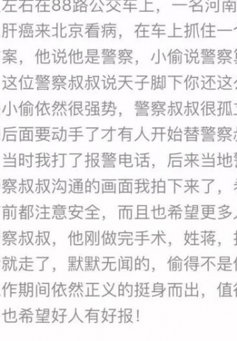 1月13日,北京88路公交车在行驶过程中,有乘客发现车上有小偷在偷一名乘客手机,一位来北京看病的老警察看到后,大喊:有小偷!被发现后,小偷奋力挣扎,叫嚣“警察来了也管不了我”。最后,公交车上安全员及其他乘客一起合力抓住小偷。