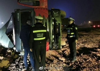 原标题:大卡车深夜工地翻车 民警积极救助暖人心