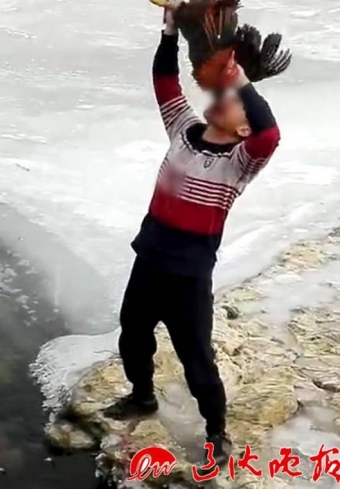 近日,一段3分多钟的视频在市民的手机中被频频转发。视频开始时,一名身穿毛衣的男子一手攥着活鸡的双脚,一手拿着手机走向河边,男子面对手机说自己要生吃活鸡,然后将手机交到一旁朋友的手上,自己拎着鸡走到一旁有河水的冰面上。在冰面上,男子对着活蹦乱