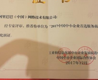1月4日,第六届中国中小企业服务大会在天津高新区举行。会上发布了“2017中国中小企业首选服务商”评选结果,阿里巴巴集团荣获工信部“中小企业首选服务商”殊荣。